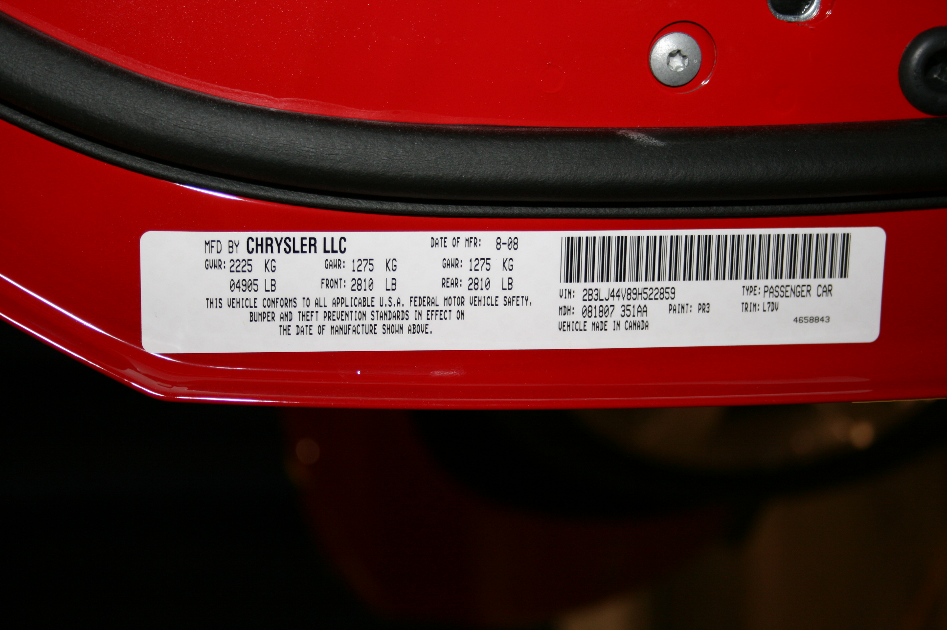FMVSS 214 INDICANT - 2009 DODGE CHALLENGE