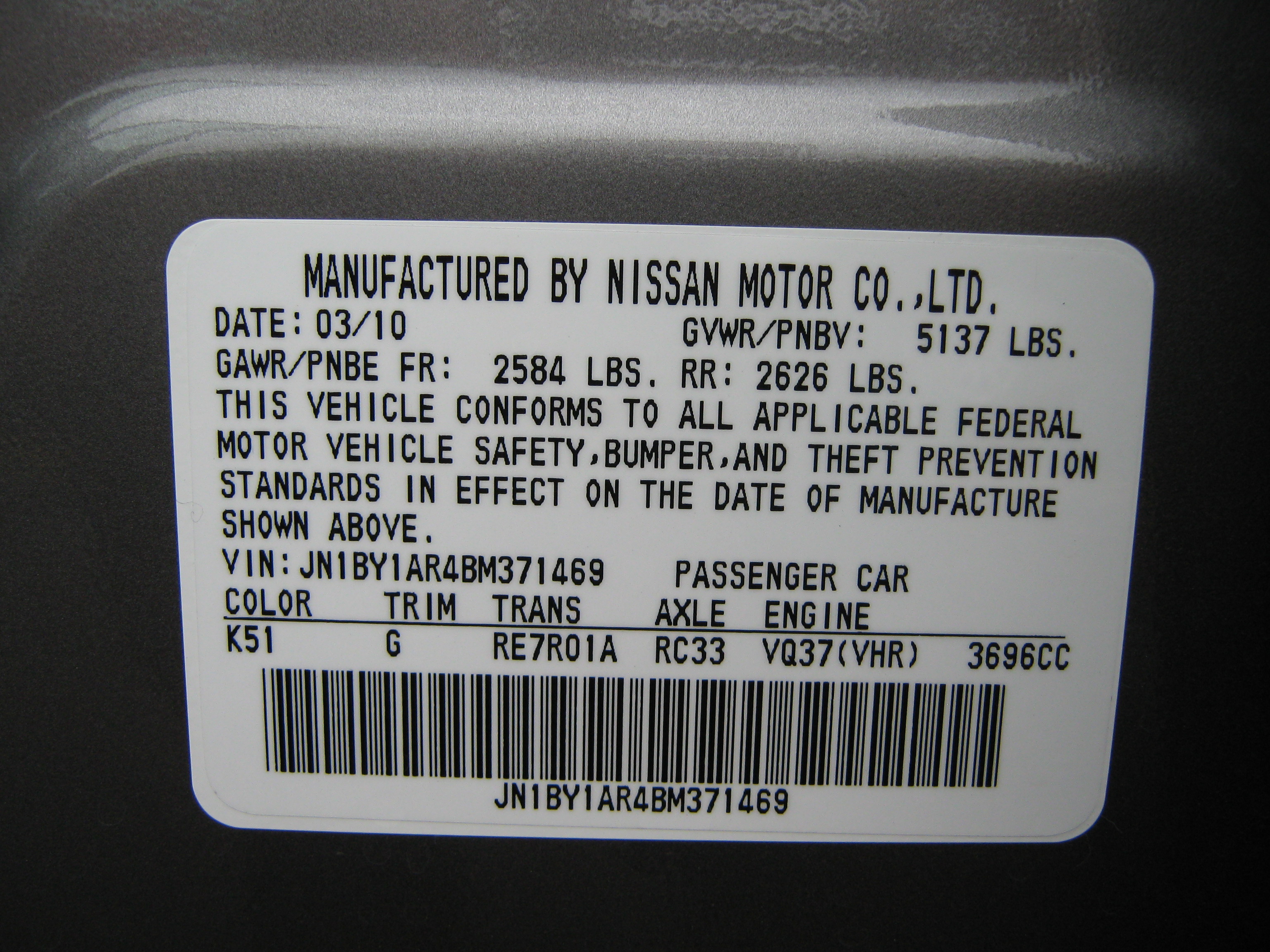 2011 INFINITI M37X STATIC SAB OOP TEST