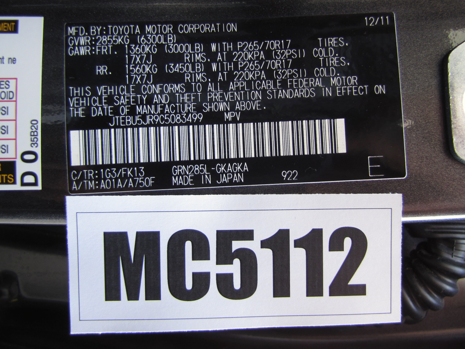 35 MPH NCAP FRONTAL - 2012 TOYOTA 4RUNNER